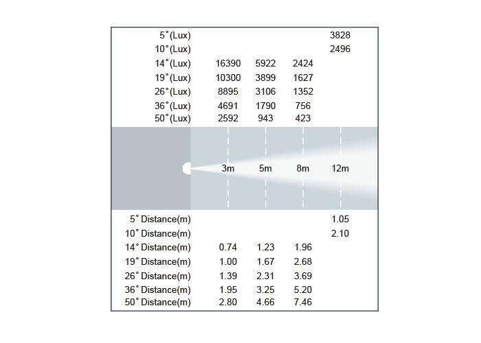 - 光束角度:5°/10°/14°/19°/26°/36°/50°/15 ~ 30°/25 ~ 50°
